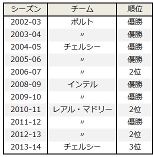 そんなモウリーニョは彼が指揮を執ったここ11シーズンで初めて2位以下になったと話題になっているようだ。ここ11シーズンの結果がこちら。