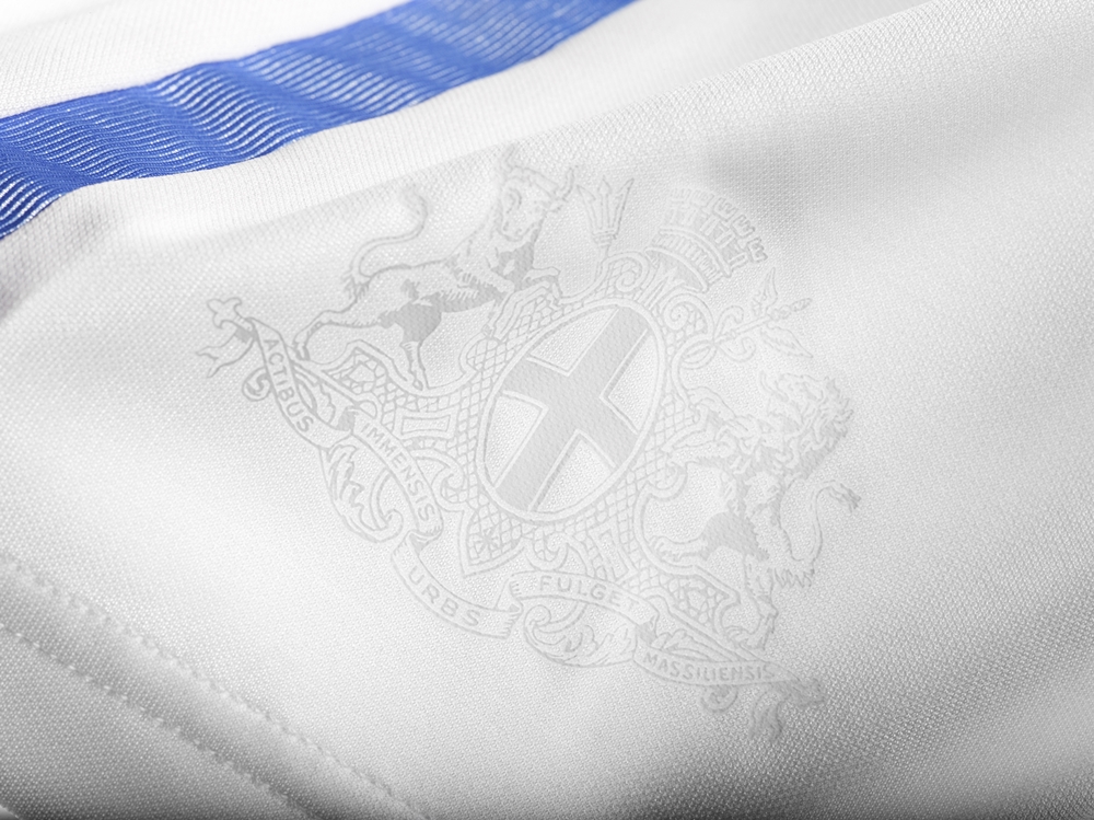 右側の裾に近い部分にはマルセイユの紋章をさりげなくプリント。近寄って見なければまず分からないが、羽織の裏地にこだわる江戸っ子のようなadidas Franceの配慮だ。