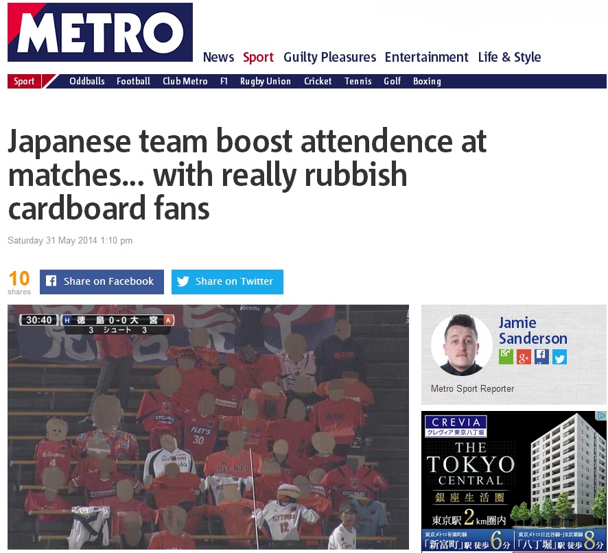 記事中では 「日本の弱小(minnows)である大宮アルディージャは試合での観客を多くするためにユニークな方法を考え付いた。席にボール紙のファンたちを座らせたのだ」 と紹介されていたが、まずアウェイだということが忘れられており、minnow=雑魚などというなかなかひどい表現も…。