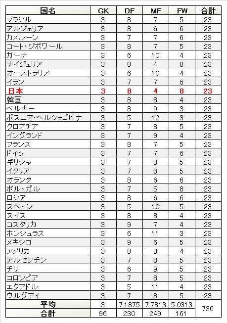 DF最多は9人のメキシコ、最小はボスニア、スペイン、エクアドルの5人で、MF最多が12人のボスニア、最小は日本とナイジェリアの4人。FWは最多が日本、ナイジェリア、ポルトガルの8人、最小はベルギー、ボスニア、ホンジュラスの3人となった。