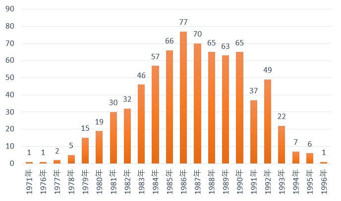 年代別最多は、1986年生まれの77人。そこを頂点にピラミッド型となっているが、1990年と1992年がやや多く、逆に1991年が少ない。