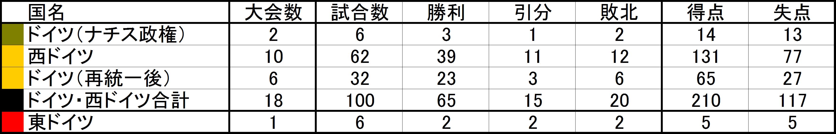 そのため、次の1994年アメリカ大会からは「ドイツ代表」として登場し、今回のブラジル大会まで本大会で好成績を残し続けています。そして、ナチス時代(創設自体はドイツ帝国時代の1900年)から現在までこの代表チームはDFBから送られているので、1934年から2014年までの3つの代表を「ドイツ」としてまとめ、そこから外れたDFVの東ドイツ代表はここから外すのが通例となっています。