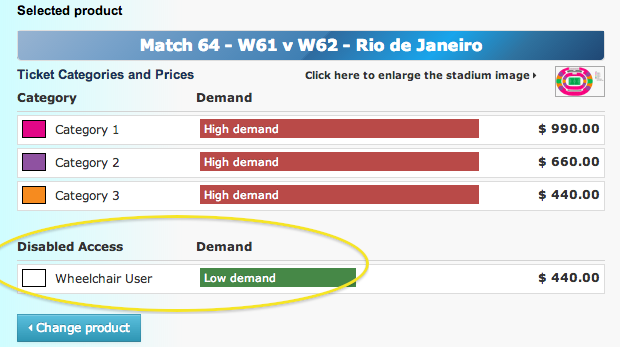 カテゴリー1, 2, 3とは異なり、チケット売れ行きが若干鈍かったそんな車椅子座席だが、今大会ではちょっとした問題が起きているようだ。