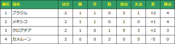 カメルーン対ブラジルでブラジルが敗れた場合のみ、勝ち点で並び得失点差で上回るため突破