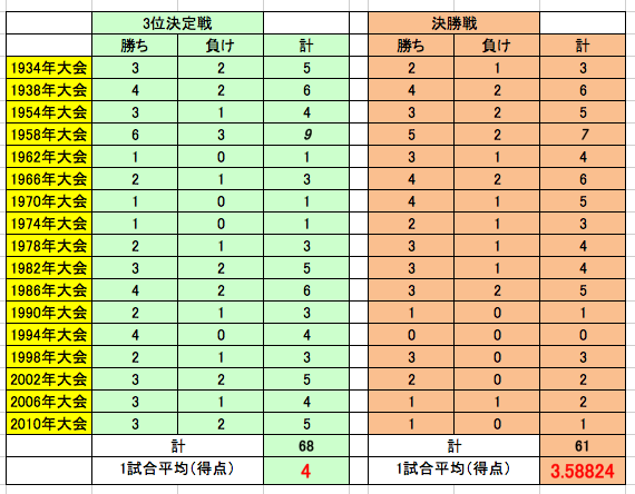 まず、W杯の全大会で生まれた3位決定戦でのゴール数を調べた。それが下の表である。緑が背景のエリアが3位決定戦の得点で、背景がオレンジのエリアが決勝戦の得点だ。