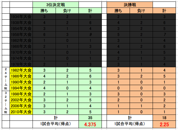 決勝戦で 平均2.25得点しか生まれていないのに対し、3位決定戦では4.375得点も生まれている。これはおよそ倍にあたる数字だ。なお、この期間中の大会全試合の1試合あたりの平均得点は2.503点。3位決定戦の得点数はこれと比較してもやはり多いことが分かる。