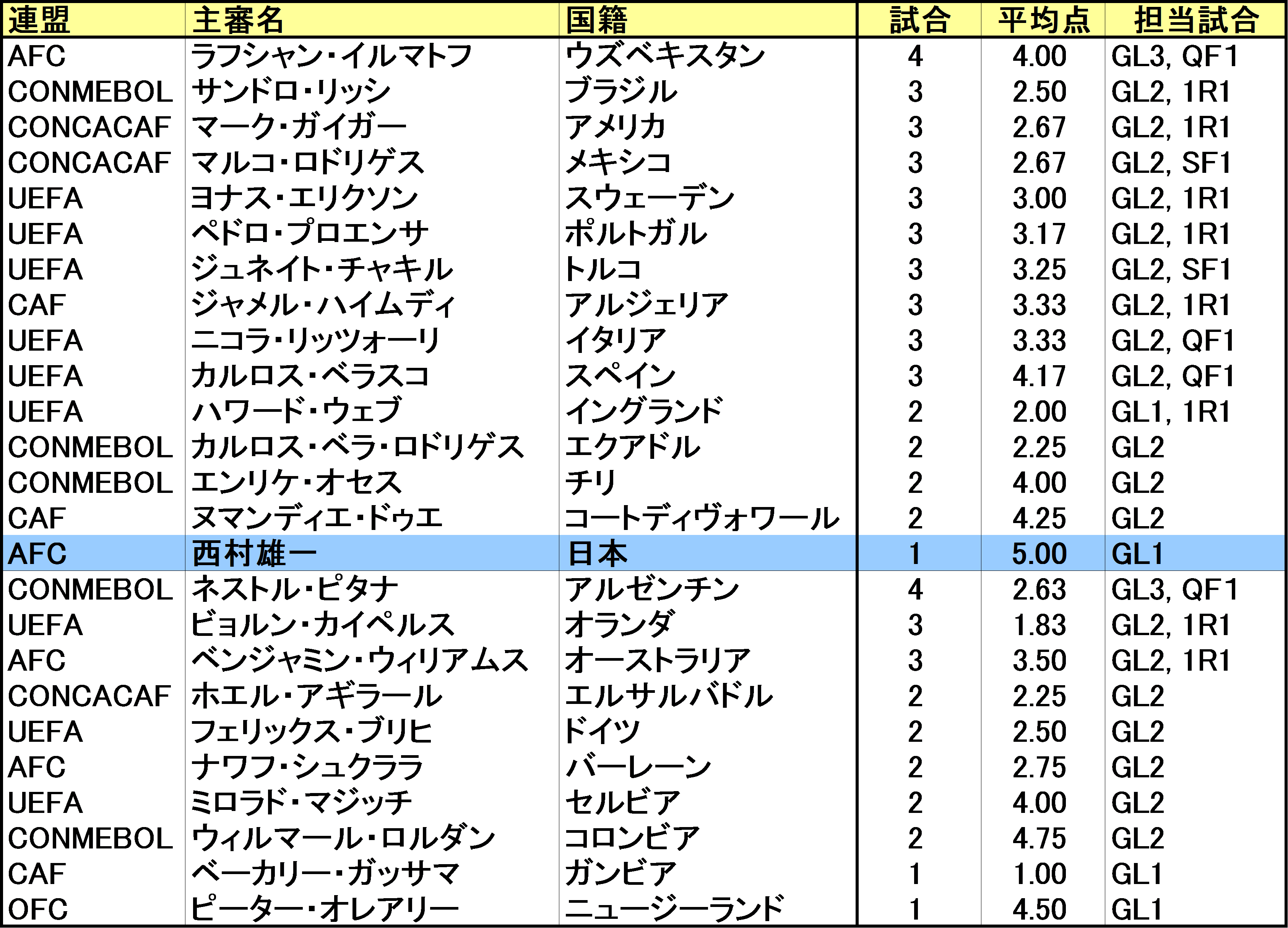 主審の話に戻ると、少なくとも「Kicker」はイルマトフに不満を持っているのが分かります。4試合で平均が4.00、例のクロアチア-メキシコ戦と「追試(?)」のアメリカ-ドイツ戦の両方で4.5だった上、残る2試合でも3.5といわば「並」の評価。開幕戦の西村には容赦なく5を付けたように、AFCの主審には全体として厳しい目を向けています。