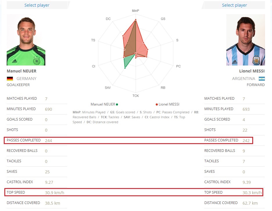 今大会ドイツは延長戦を2試合、アルゼンチンは3試合戦ったなかで、2人はほぼ同じ690分間プレー。メッシは242本のパスを成功させたのに対し、ノイアーはそれを2本上回る244本を記録していた。 さらに、トップスピードもメッシ越え…まさに恐るべし世界最強キーパーである。