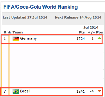 そう、衝撃的だったあのブラジル対ドイツの準決勝のスコア『1-7』がこのFIFAランキングの順位でも再現されていたのだ。偶然にしてはあまりにできすぎている。