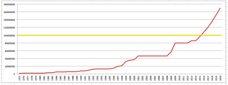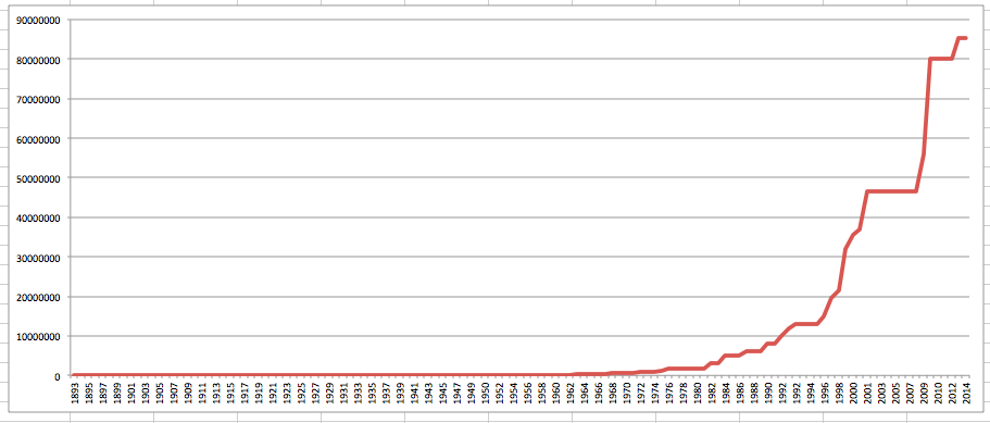 こちらが、これまで移籍金の最高額の推移である。横軸が年代(年)を表し、縦軸が当時の移籍金最高額(ポンド)を示している。