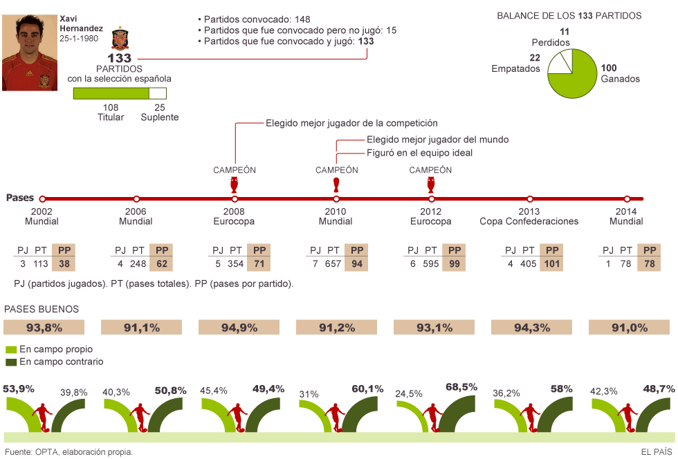 2000年に代表デビューするとW杯4大会(2002、2006、2010、2014)、EURO3大会(2004、2008、2012)に出場するなど計133キャップを刻んだ。 そのチャビの代表でのスタッツを『elpais』がまとめていたので紹介。