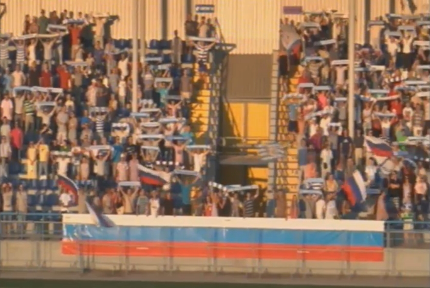 スタンド中央の大きなバナーに加え、国歌斉唱の場面ではタオルマフラーを掲げるサポーターとともにロシア国旗を振るファンの姿も見える。