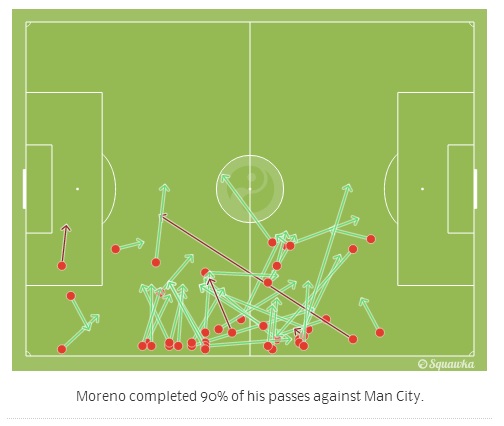 攻撃をサポートするため前方に進み出ることを好んでいたモレノのボールタッチは自陣内(48.05%)よりも相手陣内(51.95%)のほうが若干多かったという。 その(攻撃における)熱心さは左サイドに幅をもたらし、リヴァプールにとって有用な武器になるだろうとしている。 昨季、左SBとしてプレーすることが多かったジョン・フラナガンはとてもいいプレーをしていたが、右利きなために自然を内側に戻ってきていた。 その点モレノは外に行くことを苦にせず動き続けたと。 また、守備面でもいいところを見せつけ、争いでの勝率は80%。これはリヴァプール守備陣の誰よりも高い数値だったという。 そして、3つのクリアの場面ではいいアンティシペーション(予測力)も見せつけた。