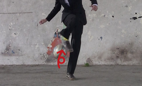 軸足にボールを押し当てながら右足を真上に振り上げる事で、ボールをすぴんさせて上に放り上げます。