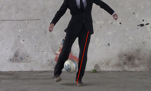 ボールを少し前方に蹴り上げ、軸足をボールの落下点のすぐ横にセットします。