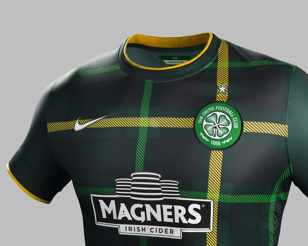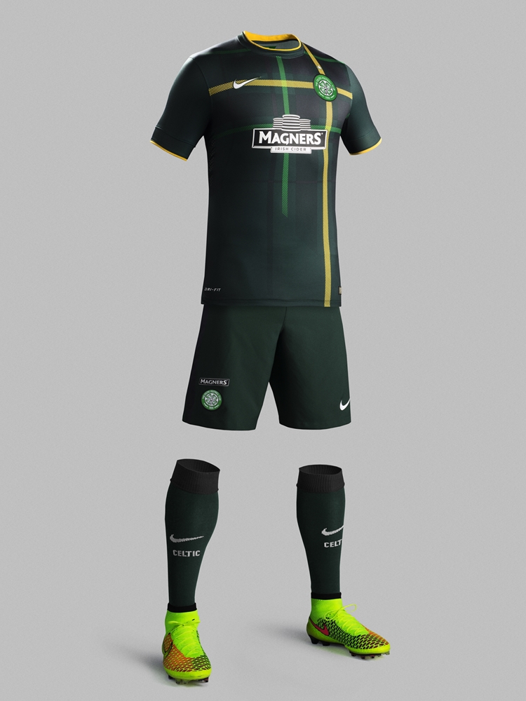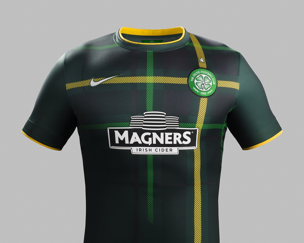 そのセルティックの2014-15新ユニフォーム、アウェイは濃い緑をベースに、スコットランド北部のハイランド地方で発達したタータンチェックを採用。左右非対称のアシンメトリーデザインとなっており、左胸には「ケルト十字」をイメージした黄色のラインがエンブレムを中心に入れられている。