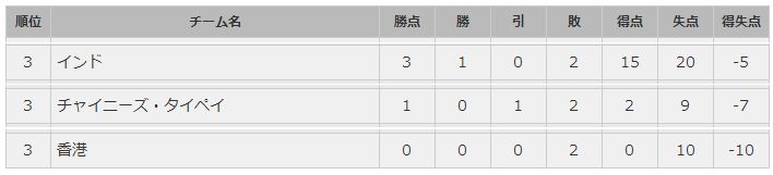 A組のインドが1勝2敗得失点差-5、B組の台湾(チャイニーズ・タイペイ)が1分2敗得失点差-7、C組の香港が2敗得失点差-10と、数字だけ見ると香港は最下位である。