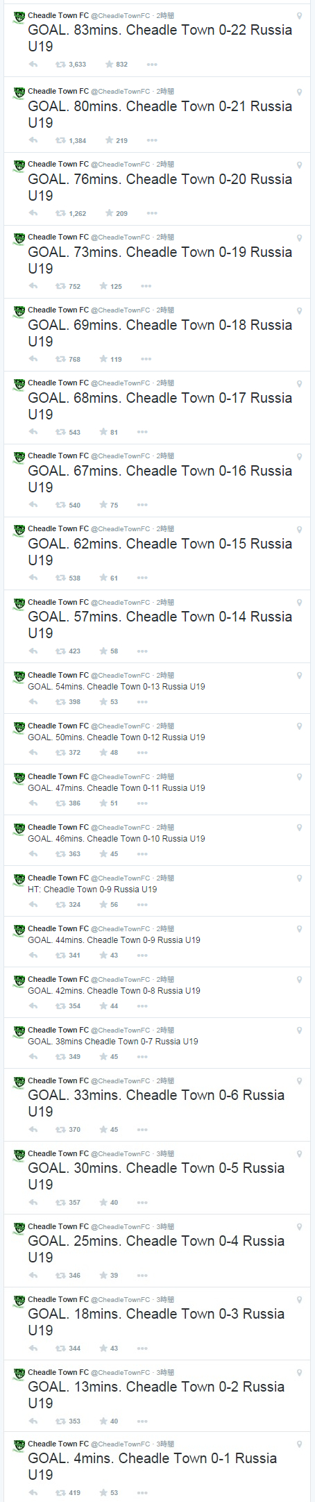 0-22・・・なんともむごい点差のついた試合結果は6000を超えるリツイート数を記録するほど話題になっている。そして、スコア実況をしたチードル・タウンのツイートを見ていくと得点経過とともに、段々と関心を呼んでいくさまがリツイート数から伺える。