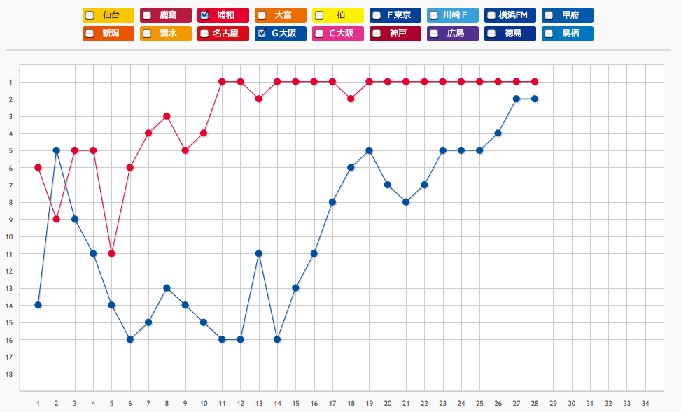 こちらはJリーグ公式HPに掲載されている、今シーズンのJ1における順位推移表。青の折れ線グラフがG大阪の順位推移であり、赤の折れ線は首位を行く浦和レッズのものだ。