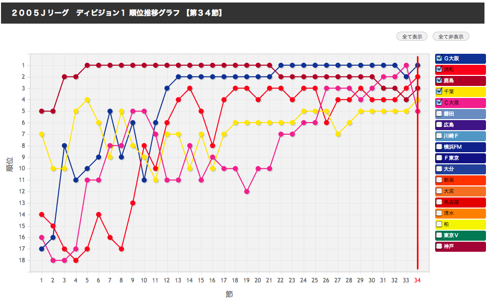 ちなみに、史上稀に見る混戦となりG大阪が最後にJ1で優勝を果たした2005年シーズンの推移表はこちら。