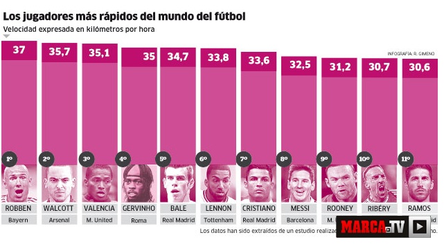 ロッベンの37キロは盛ってる疑惑も出ていたのだが、こういう結果になるらしい。ただ、ピッチ上で発揮されるスピード自体がある意味水物ではあるので・・・