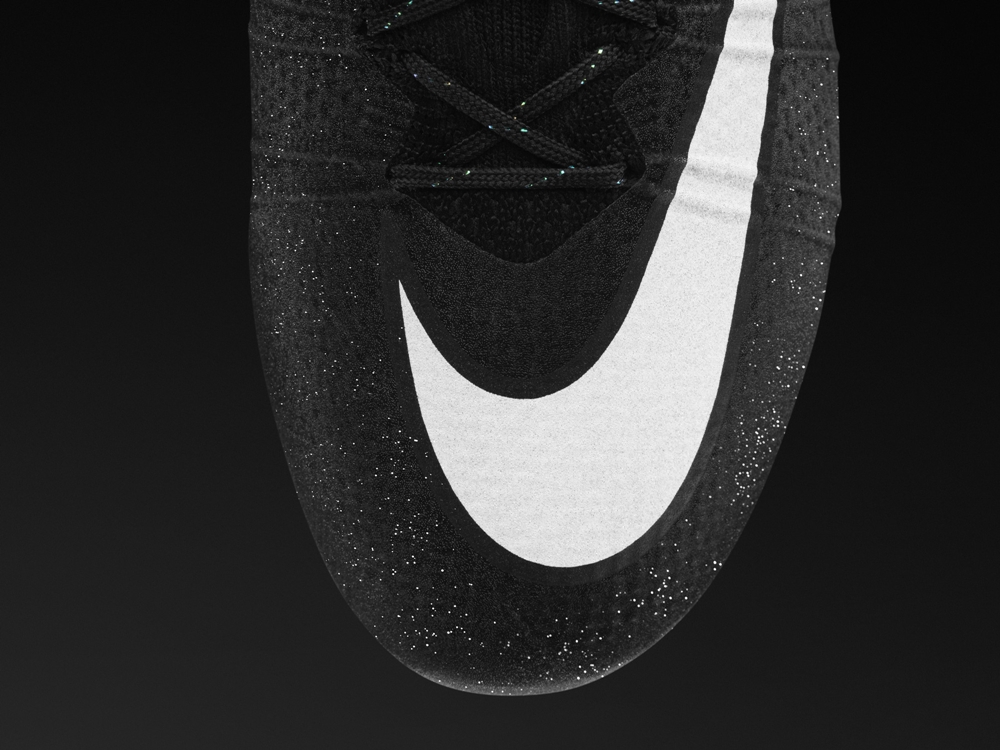 注目はそのカラーで、一見すると普通の黒だが、実は新しくなったナイキスキンテクノロジーを用い、光を放つような効果を取り入れた特殊なアッパーを使用。