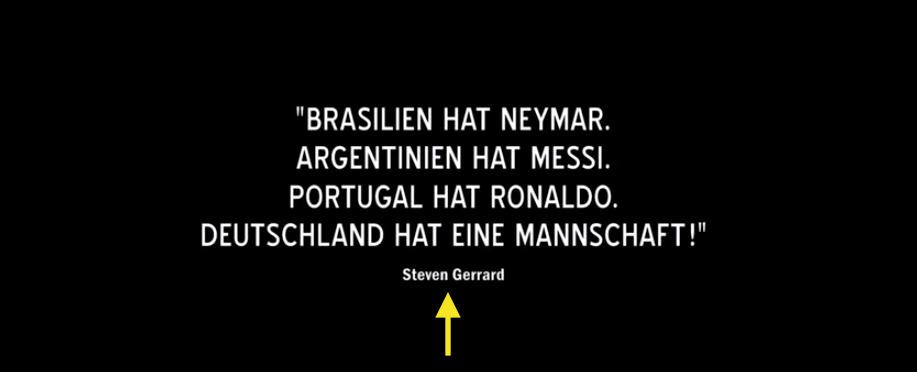 冒頭に記されたこのメッセージはあのスティーヴン・ジェラードのもの。意味は「ブラジルにはネイマールがいる。アルゼンチンにはメッシがいる。ポルトガルにはロナウドがいる。そして、ドイツにはチームがあるんだ」で、個に依存しないドイツ代表の強さを表す言葉として紹介されている。