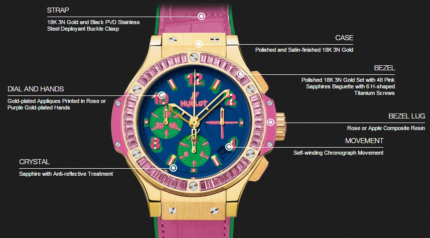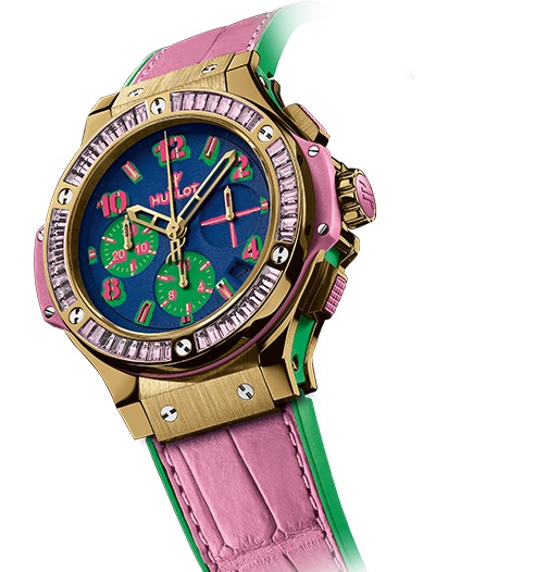 ド派手なゴールドとピンクが目にもあざやかなこの時計はスイスの高級時計、Hublot(ウブロ)の一品。