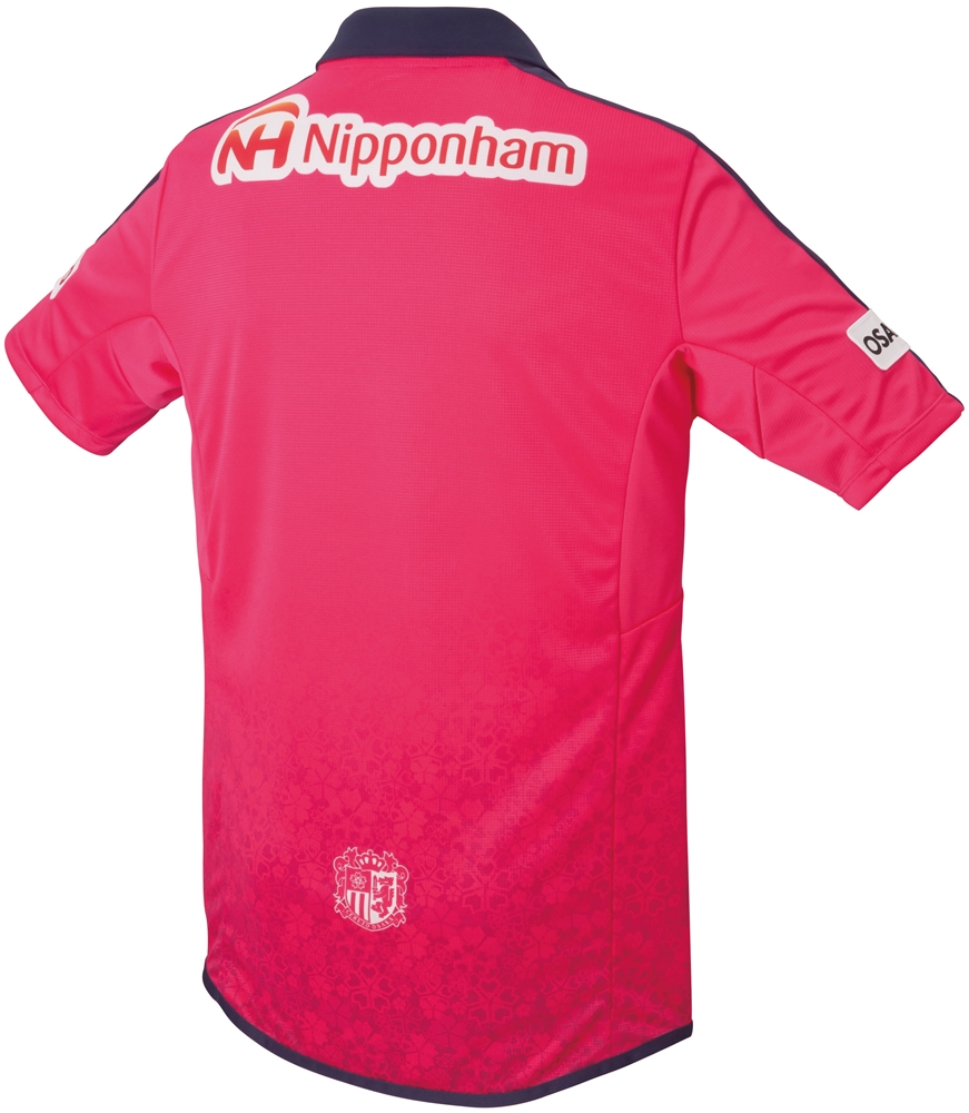 ユニフォーム下部に透かしで桜柄のグラデーション。背面にはさらにクラブエンブレムが入れられている。