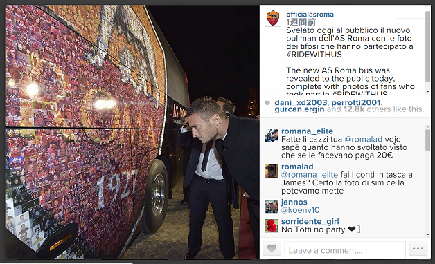 バスの側面に描かれたローマのエンブレムを覗きこむローマのカピタン、トッティ。よく見てみるとこのエンブレム、ローマファンの写真(ローマの選手の写真)によって構成されているのだ。ファンにとってはたまらなく嬉しいアイディアである。