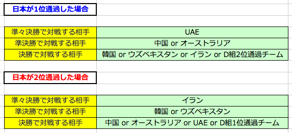 目標が連覇である以上どちらが得、損ということはないが、仮に日本がグループDを首位で通過すれば、前回大会で実現した日本対オーストラリアという組み合わせが決勝戦で再現される可能性は消滅する。