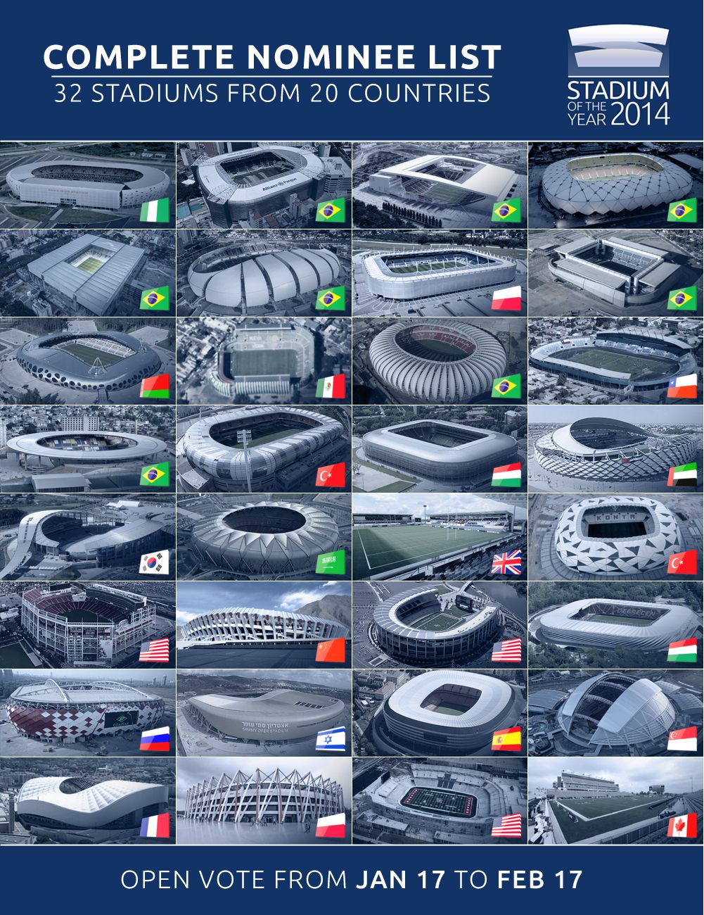 今回発表されたスタジアムの中からユーザー投票が行われ、2014年最高のスタジアムが決定される。発表日は2月17日。昨年行われたブラジルワールドカップの全12会場のうち、6会場がノミネートされている。