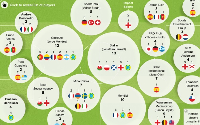 その選定法は 昨季のプレミア上位8チーム、セリエA・リーガ・ブンデス・リーガ1の上位4チームに所属している選手をどれだけ抱えているかというもの。エージェントとなっているが、事務所も出てくるうえ、所属選手だけでなく大物監督をカウントしているケースもある。