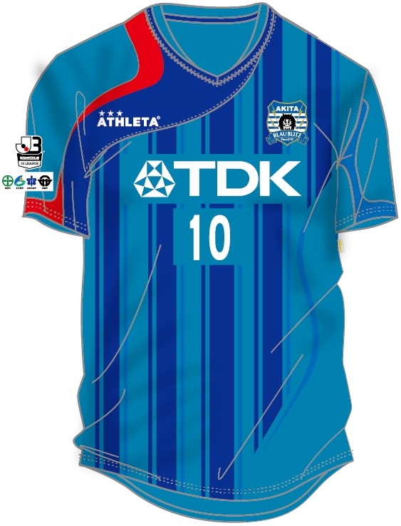 発表された秋田の2015シーズン新ユニフォームは、ホーム(1st)がこれまで同様鮮やかなターコイズブルーをベースに、濃淡のストライプ柄を採用。右肩部分には秋田県のカラーである「えんじ色」をイメージし、赤をアクセントカラーとして取り入れている。
