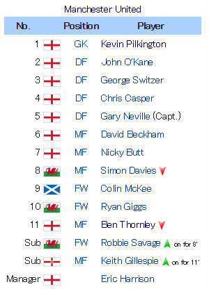 当時の選手表を見てみると、トレブル(3冠)に貢献した選手以外にもロビー・サヴェージ、サイモン・デイヴィス、キース・ギレスピーら長くプレミアリーグでプレーした選手が在籍している。