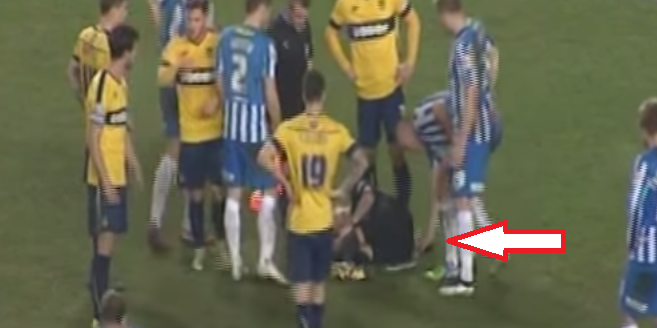 黄色のユニフォーム、オックスフォードの選手がシュートを放ったところで、コースを開けようととっさに動いた主審が転倒。ヒザのあたりを抑えてうずくまるミラー主審は起き上がることができず。