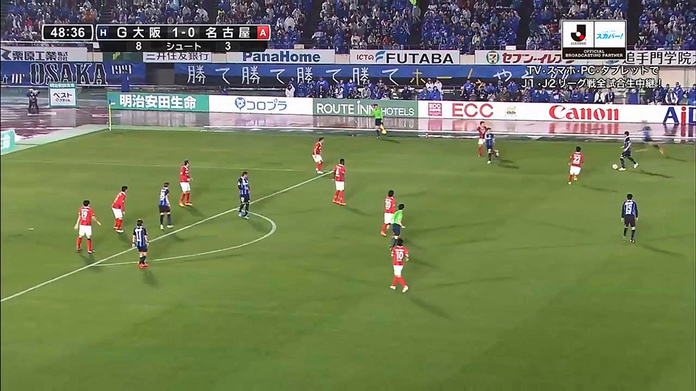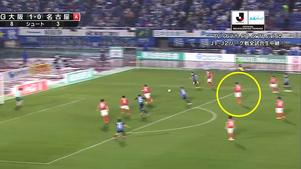米倉へのスルーパスが出た段階で名古屋のDFラインはGKとの間のスペースを埋めるため下がることになり、当然彼らの前に生まれたスペースはボランチがカバーする。これはアマチュアでも当たり前の“ルール"だ。