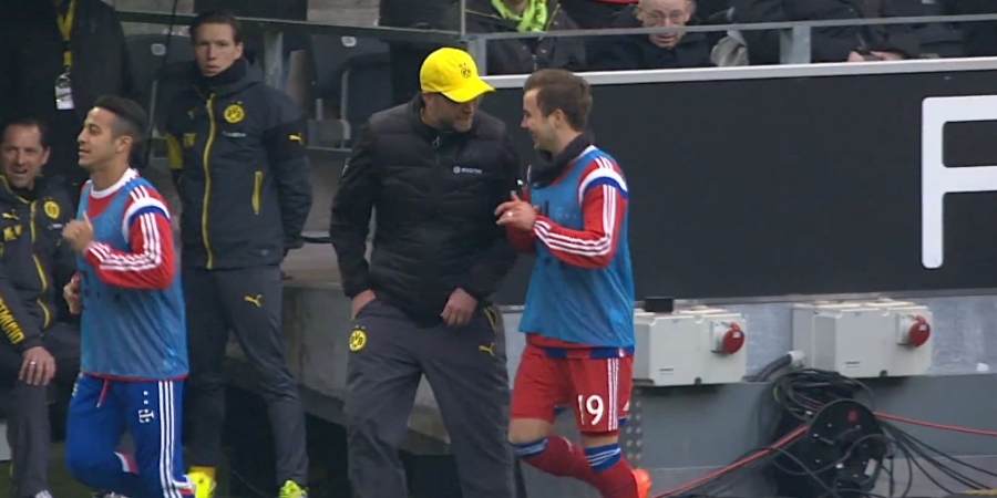 後半、マリオ・ゲッツェがゴール裏の「黄色い壁」の前でウォームアップを行ったところ、案の定ドルトムントサポーターは“裏切者"に対して大ブーイング。やむをえずベンチ前に戻ってきた彼に、ユルゲン・クロップ監督が声をかけたのだった。