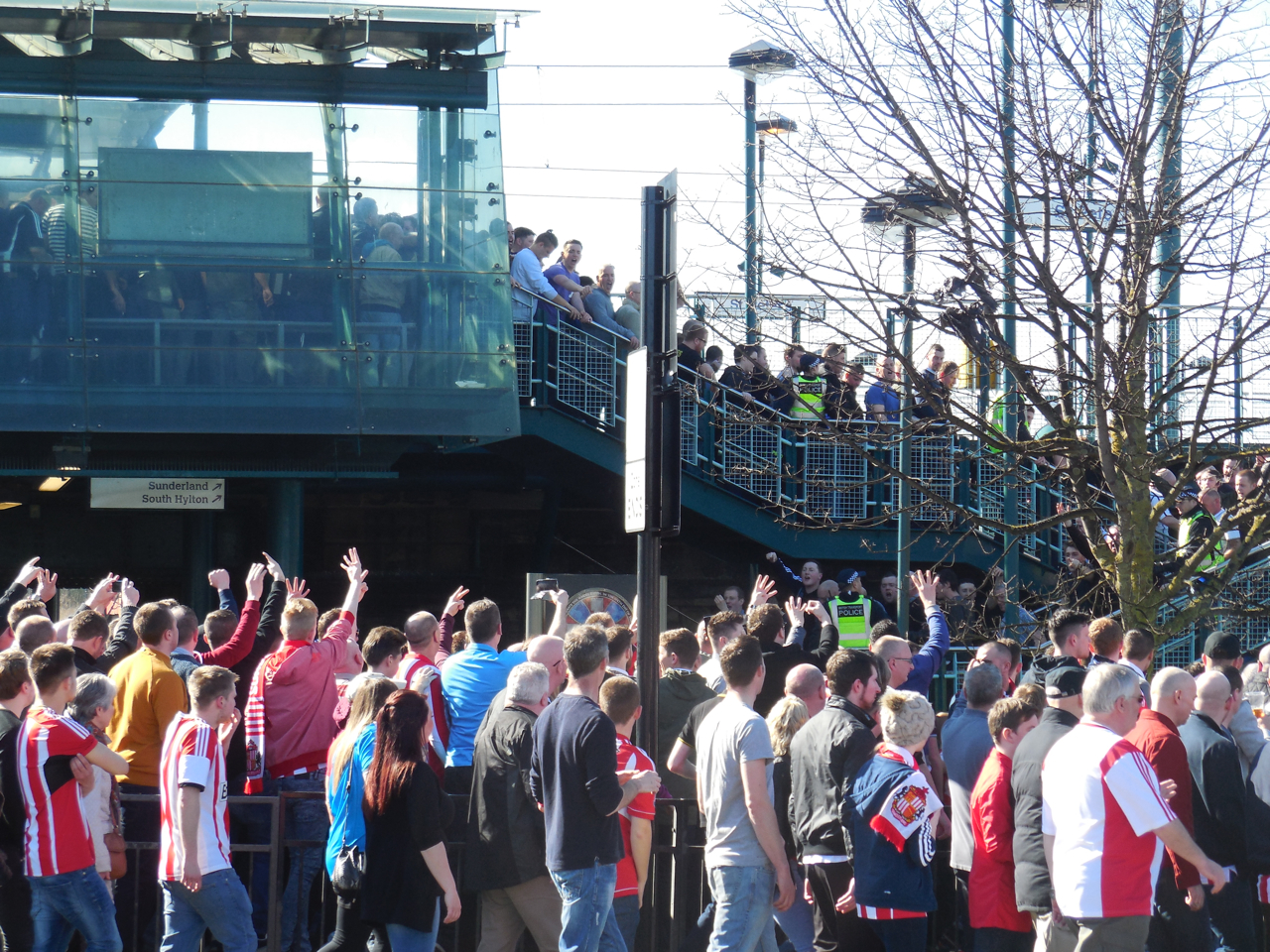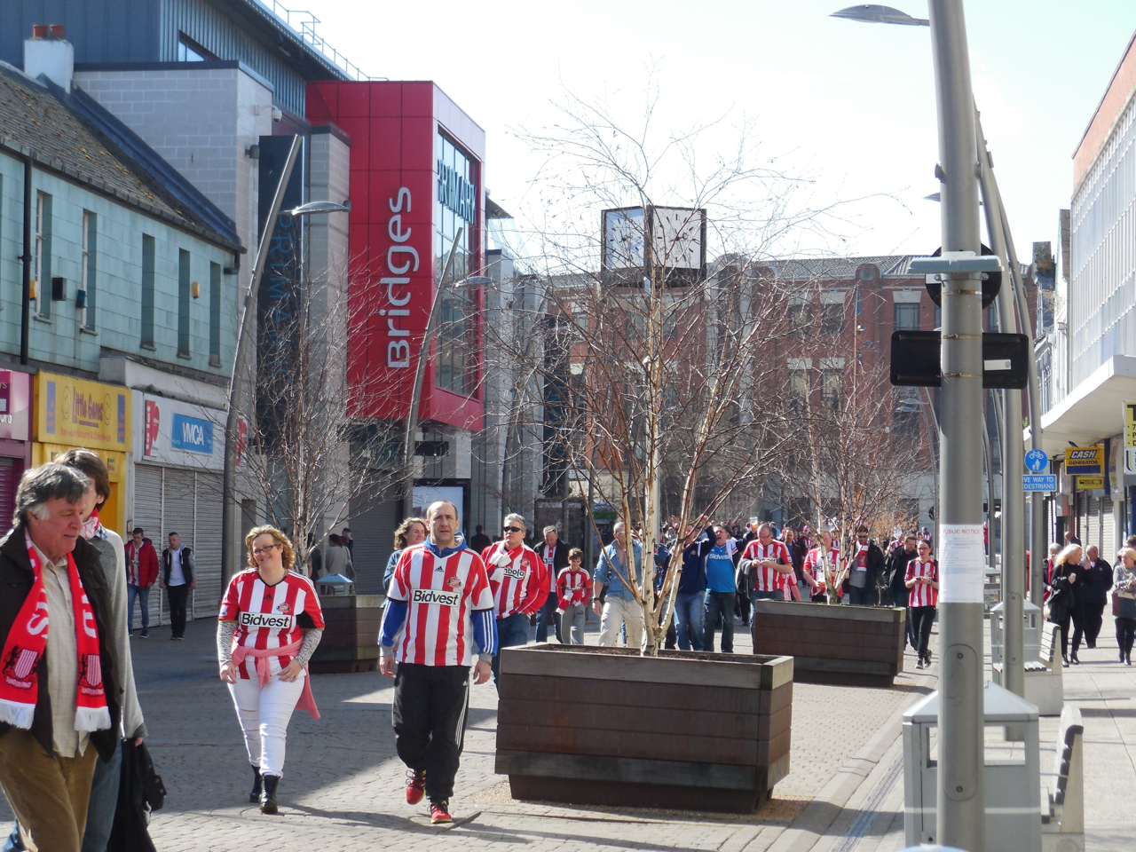 遠くで聞こえていた歌声が少し近づいてくるような気配を感じ、筆者は駅前を後にした。いつもは買い物客で賑わう大通り。だがこの日は、赤と白を基調とした地元クラブ、サンダーランドのグッズを身につけた人々で活気づいていた。試合開始2時間前、ファンたちがスタジアムへと向かい始める時間帯だ。