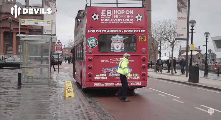 “リヴァプール"なバスの隣にもこの通り。仮にバレれば、一触即発に違いない。