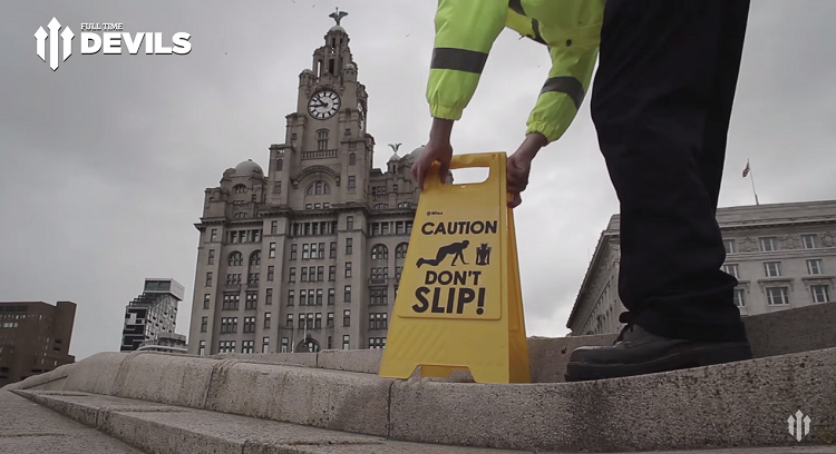 リヴァプールの街に置いていかれるのは、「注意:滑らないで」と書かれた黄色いコーンである。