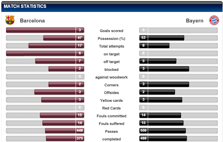 上からの2項目目の"Possession(支配率)"にご注目。バルセロナ47%、バイエルン53%となっている。そう、ポゼッションサッカーを信条とするバルセロナが支配率でバイエルンを上回れなかったのだ。