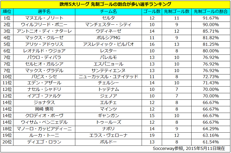 欧州5大リーグ(スペイン、イングランド、ドイツ、イタリア、フランス)において10得点以上あげている85選手を、先制ゴール率の高い順に並べその上位20選手を記している。
