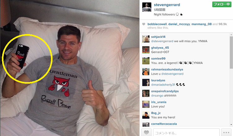 一見なんでもないこの投稿だが、よく見るとあることに気付く。実はジェラード、Tシャツとスマホケースのブランドを揃えているのだ。