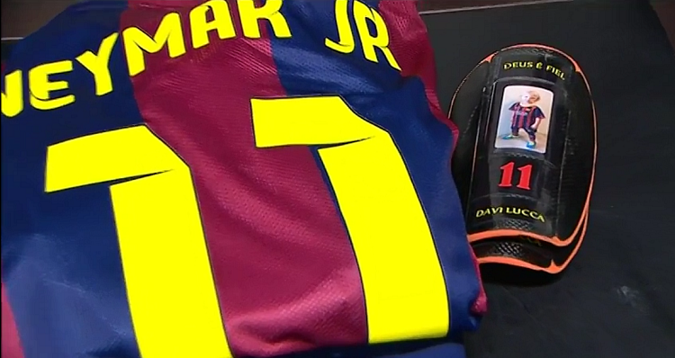 ネイマールは息子のダヴィド・ルッカくんの姿をレガースに入れていた。