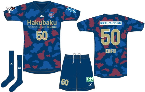 甲府は前身の「甲府サッカークラブ」が創設されてから今年で50周年。それを記念して先日発表された新ユニフォームは、これまでの50年に感謝し、これからの50年、そして100年もともに歩み、戦い続けるという強い想いが込め込められたデザイン。なんとホームタウンである山梨県の全市町村の形状を迷彩柄のモチーフとして取り入れている。