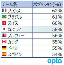 「パスで崩し切って得点」といえば、バルセロナのポゼッションサッカーが思い浮かぶ。なでしこジャパンもここまで58%と高いポゼッション率を保っている。これまたフランス、ブラジルらに次ぐ4位の値だ。