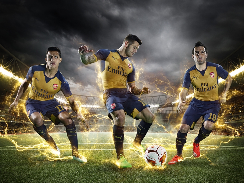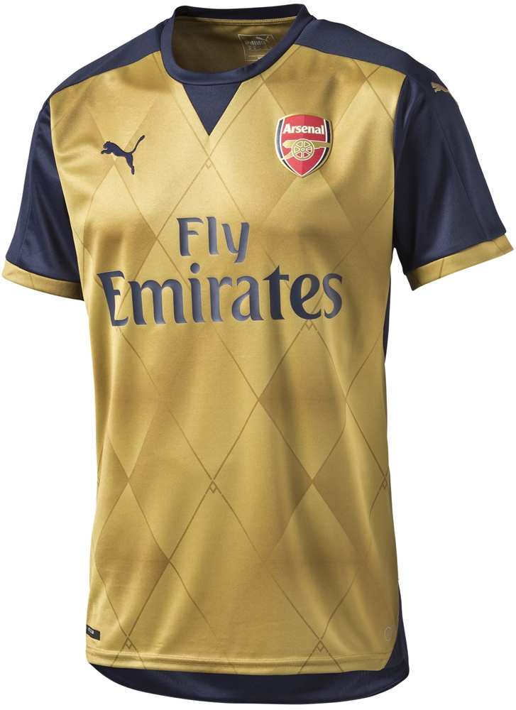 ホームに続いてお披露目されたアーセナルの2015-16アウェイは、伝統的なアウェイカラーである黄色のトーンを進化させたという深くてリッチなゴールドを基調にしたデザイン。