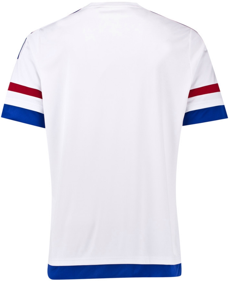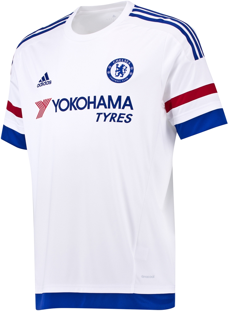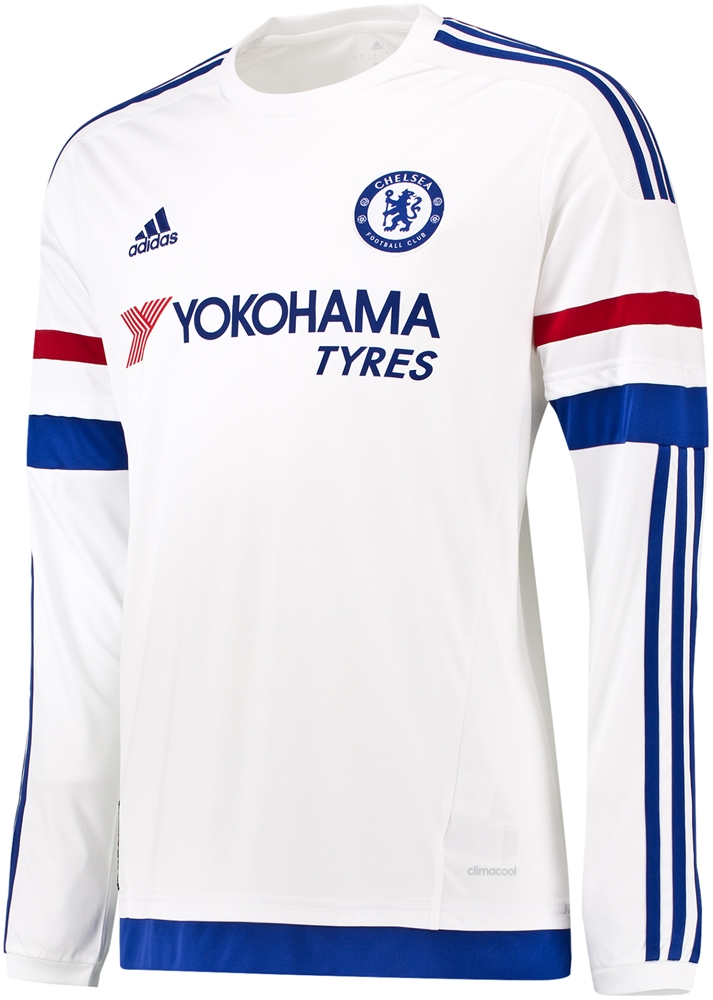 2015-16アウェイは白を基調に、クラブカラーの青、さらに過去110年のクラブ史において度々アウェイカラーとして用いられてきた赤を組み合わせたデザイン。特に袖の“トリコロール”が印象的で、フランス、あるいはadidas繋がりで横浜F・マリノスを想起させる(胸が「YOKOHAMA」だけに)。