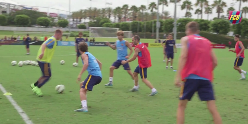コパ・アメリカに出場したリオネル・メッシやネイマールなどが不在の中で行われているトレーニング。お馴染みのロンドに続いて映し出されたのは、4人ずつ赤・黄・ビブスなし(青)に分かれての8対4だ。